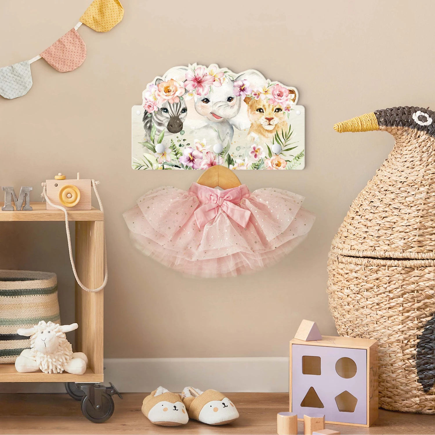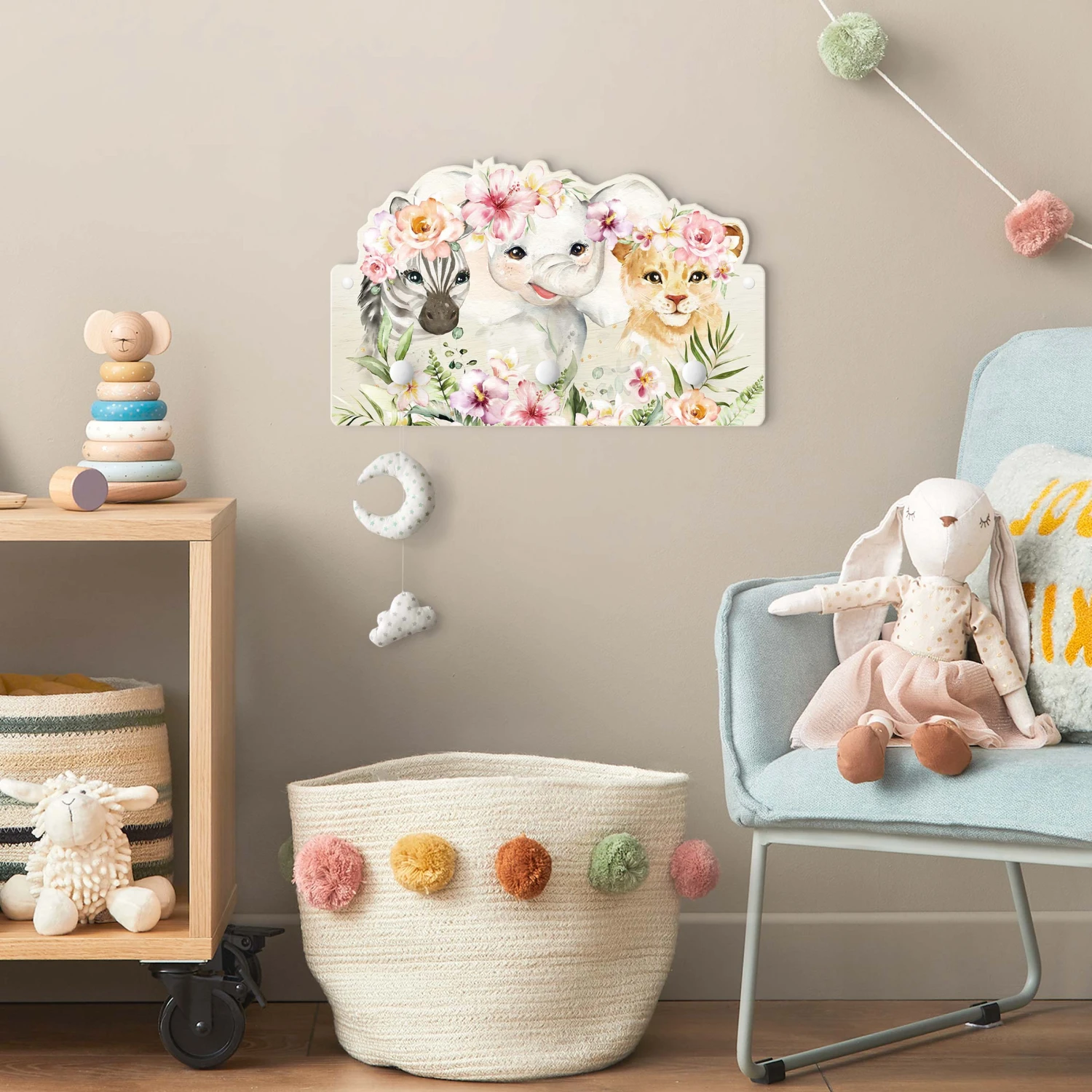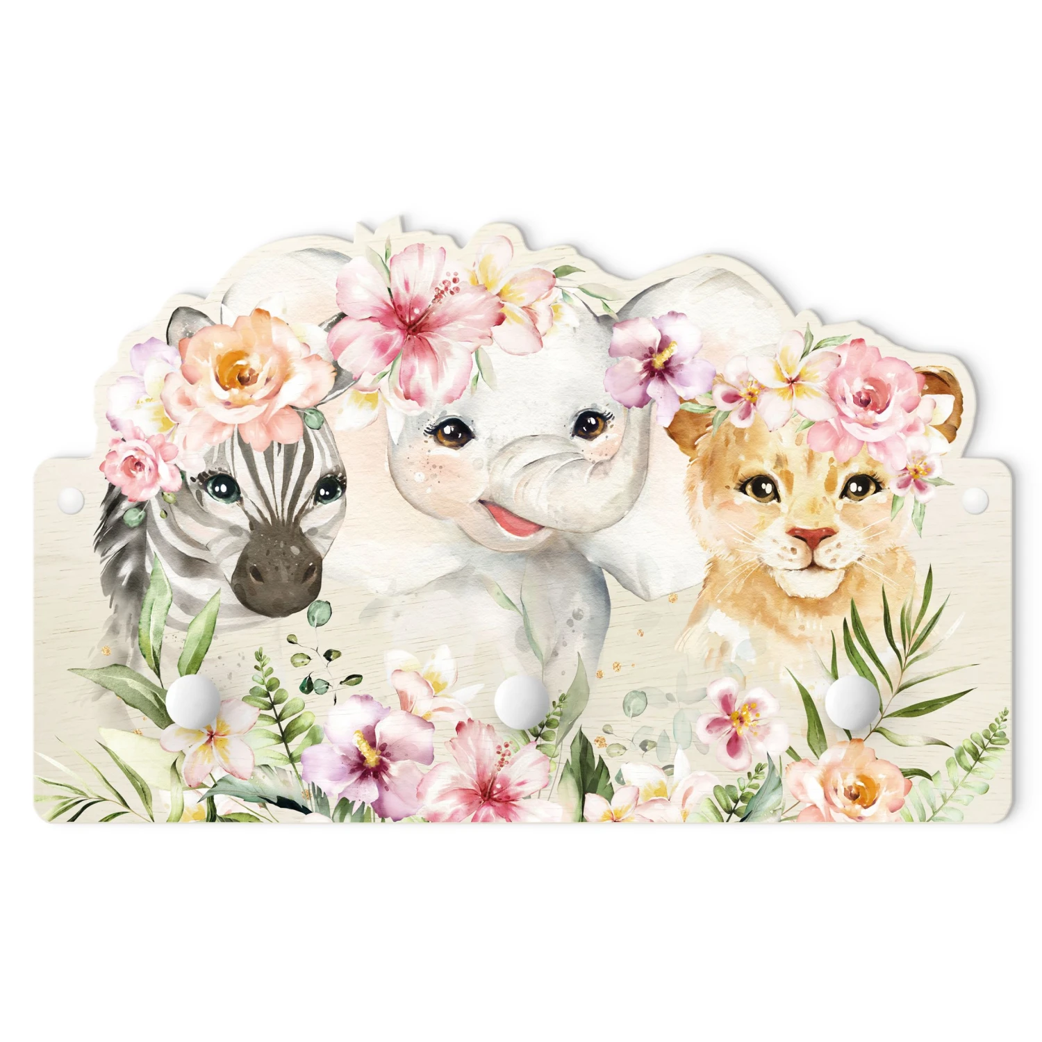 Kindergarderobe Holz – Aquarell Zebra Elefant Löwe Blüten In Pastell